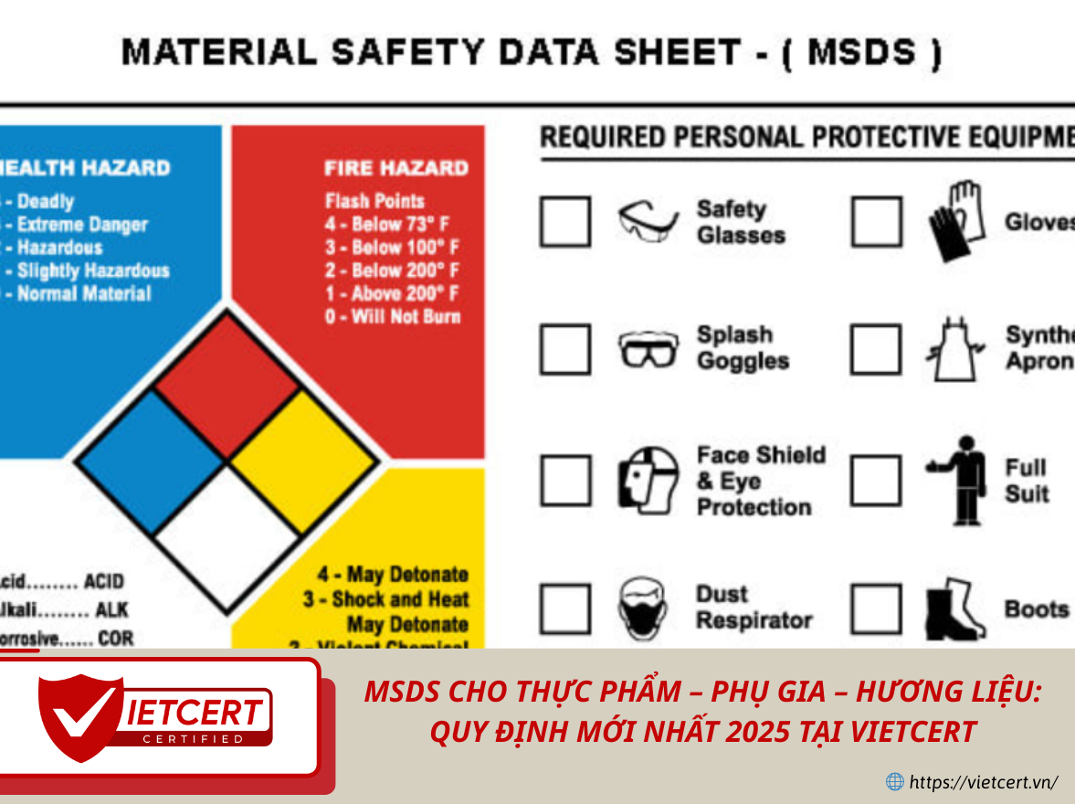 Vietcert là đơn vị uy tín cung cấp dịch vụ tư vấn, xây dựng MSDS chuẩn GHS cho ngành thực phẩm, phụ gia và hương liệu, giúp doanh nghiệp tuân thủ pháp lý và lưu hành sản phẩm an toàn. Bài viết dưới đây sẽ phân tích chi tiết về MSDS, quy định mới nhất 2025 và hồ sơ cần chuẩn bị.